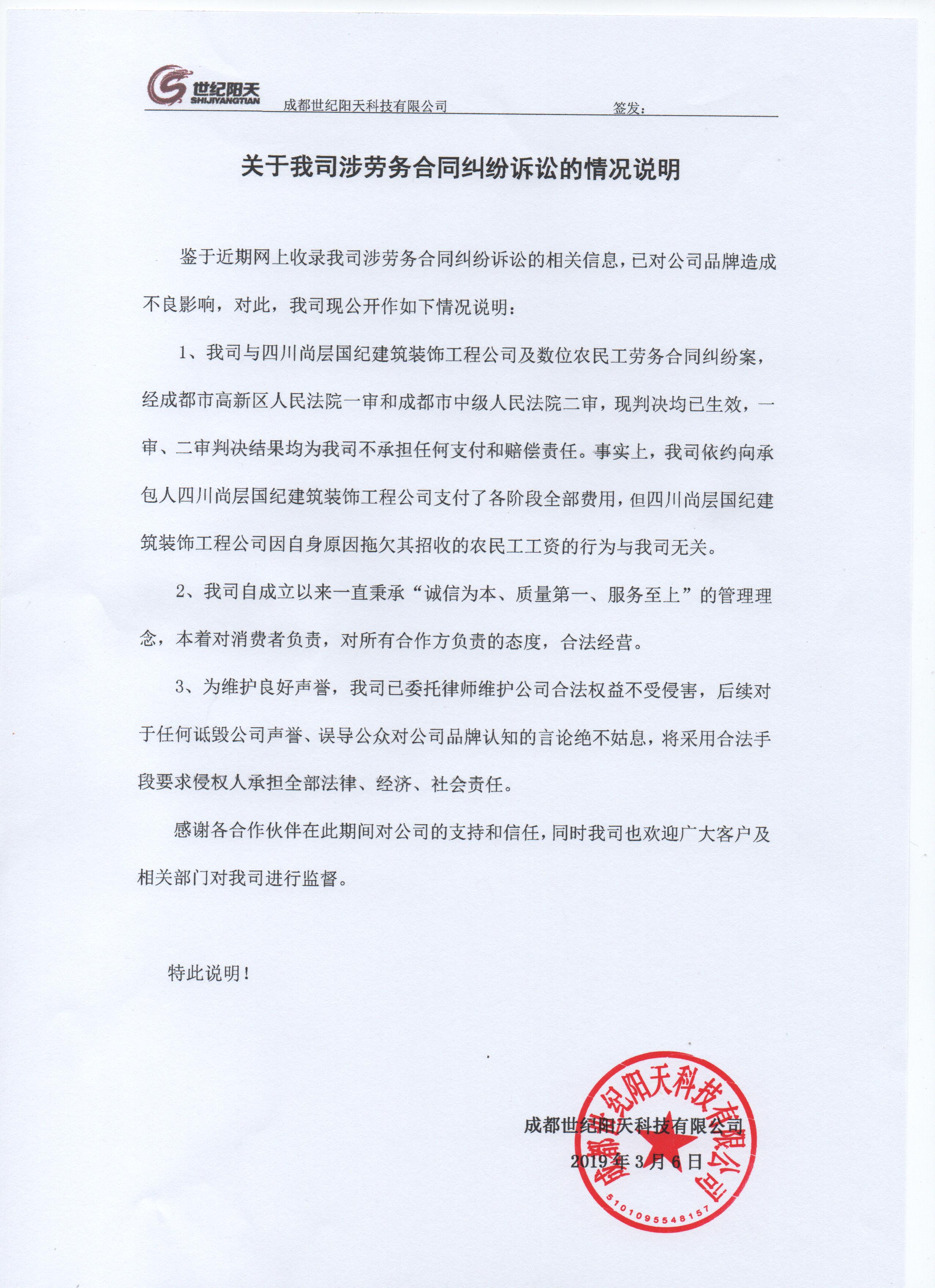 世紀陽天:關(guān)于我司涉勞務(wù)合同糾紛訴訟的情況說明
