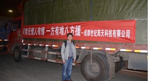 災(zāi)難無情人有情,2013年4月23日在成都世紀(jì)陽天科技有限公司救災(zāi)物資及人員在總經(jīng)理肖開強的帶領(lǐng)下于晚上20:00踏上了通往災(zāi)區(qū)的征程,此行目的地是重災(zāi)區(qū)天全縣。