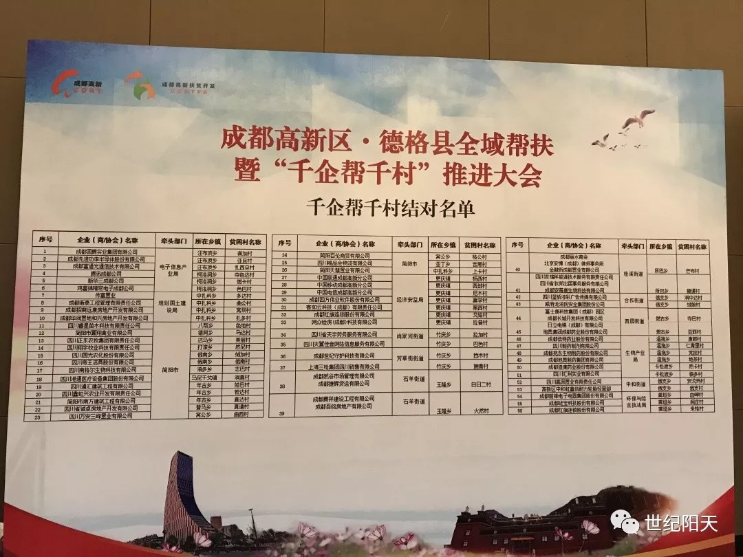 導(dǎo)語:12月7日上午9點,成都市高新區(qū)“對口幫扶德格縣全域幫扶暨千企幫千村”精準(zhǔn)扶貧行動推進大會在通威國際中心召開。省、市、區(qū)有關(guān)領(lǐng)導(dǎo)共同出席了本次大會。成都世紀(jì)陽天旗下互聯(lián)網(wǎng)教育品牌世紀(jì)守護CEO唐紅林先生代表公司參加并聽取了會議的主要內(nèi)容。